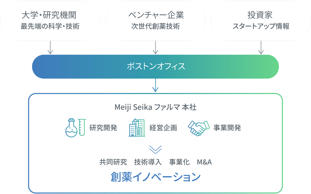 「Meiji Seika ファルマは、革新的な治療薬や予防薬を一日も早く患者さんや医療現場に届けることを目指しています。そのためには、いち早く新薬の『原石』を見いだすことが重要です。原石を持つベンチャー企業に投資し革新的な技術に育てることで、私たちのイノベーションを加速させる。それがボストンオフィスのミッションです」(高畑)