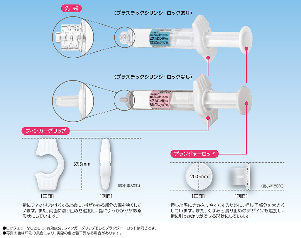 ヒアルロン酸Na関節注シリンジ「明治」には、注射針の取り付け部が異なるルアーロックあり、ルアーロックなしの2種類があります。
