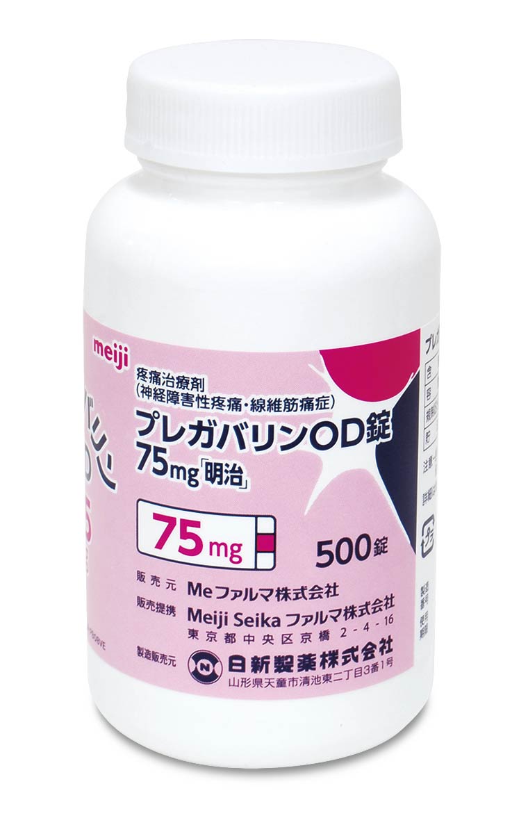 | Me ファルマ製品 | プレガバリンOD錠75mg「明治」 | 製造販売元 日新製薬株式会社 販売元 Me ファルマ株式会社 |