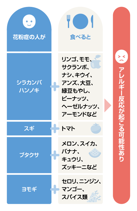 「花粉-食物アレルギー症候群」と呼ばれるもので、花粉に対するアレルギーがある人が、花粉の成分に似たタンパク質を含む果物を食べると、免疫がまちがえて“花粉が来た!”と反応してしまうことがあるんだよ。