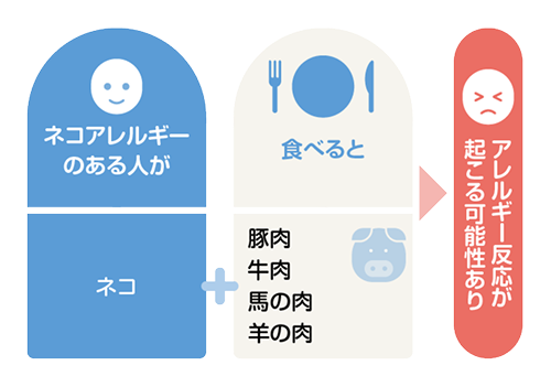 交差反応には、花粉と食べ物のアレルギー(花粉-食物アレルギー症候群[しょうこうぐん])、ラテックス(天然ゴム)と果物などとのアレルギー(ラテックス-フルーツ症候群)、ネコと豚肉などとのアレルギー(ポーク-キャット症候群)などがあります。