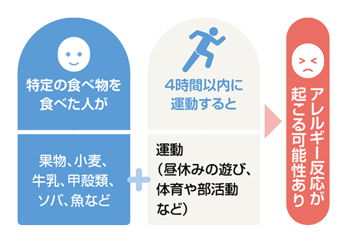 食べただけでも、運動しただけでも起こらないのに、特定の食べ物(特に小麦、甲殻類[こうかくるい]、果物など)を食べたあと(通常4時間以内1))に運動することでアレルギー反応が起こって全身に影響が及ぶことがあります。