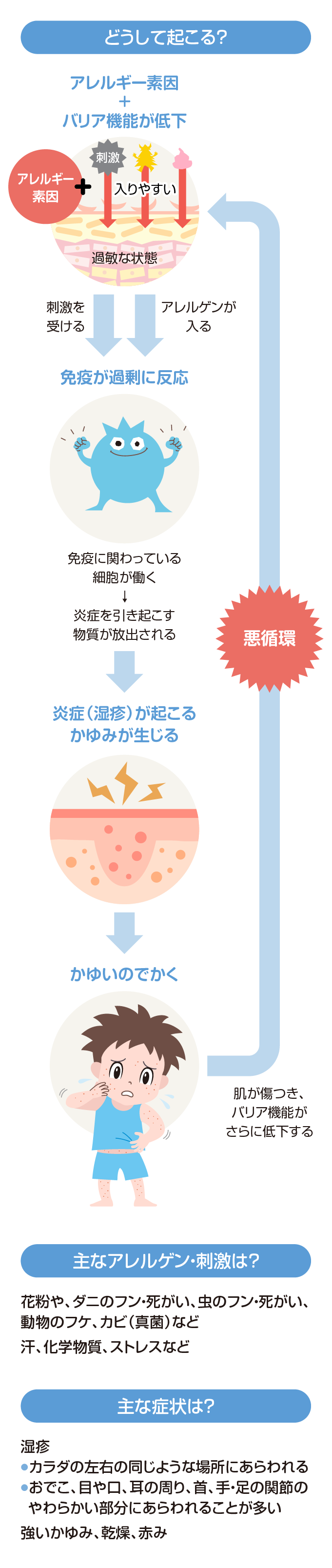 アトピー性皮膚炎は、皮フを防御(ぼうぎょ)しているバリア機能の低下が原因で起こる一面(肌が乾燥しやすく、刺激などが入りやすい)と、アレルギーの要素(アレルゲンに対して免疫が過剰に反応する)という2つが合わさって起こる病気です。