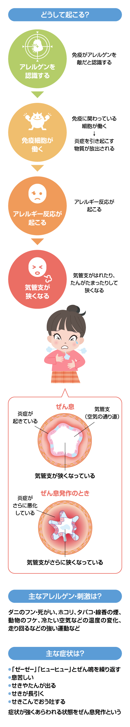 気管支が狭くなると、呼吸がじょうずにできないため息苦しさを感じたり、狭い気管支を空気が通るので「ゼーゼー」「ヒューヒュー」という音(ぜん鳴[めい])が生じたりします。