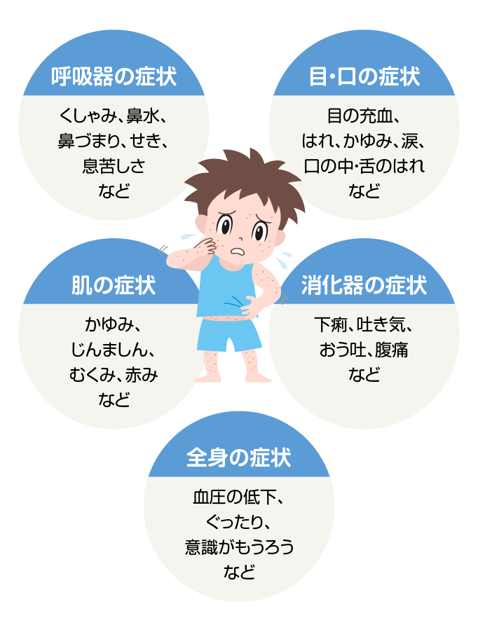 | どんなアレルギーがある? | アレルギー性鼻炎・花粉症、食物アレルギー(大部分は即時型)、アトピー性皮膚炎、気管支ぜん息、アナフィラキシーなど |