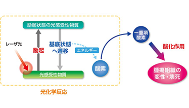この抗腫瘍効果は、レーザ光と光感受性物質との光化学反応によって生成される一重項酸素(活性酸素の一種)の強い酸化作用によります。